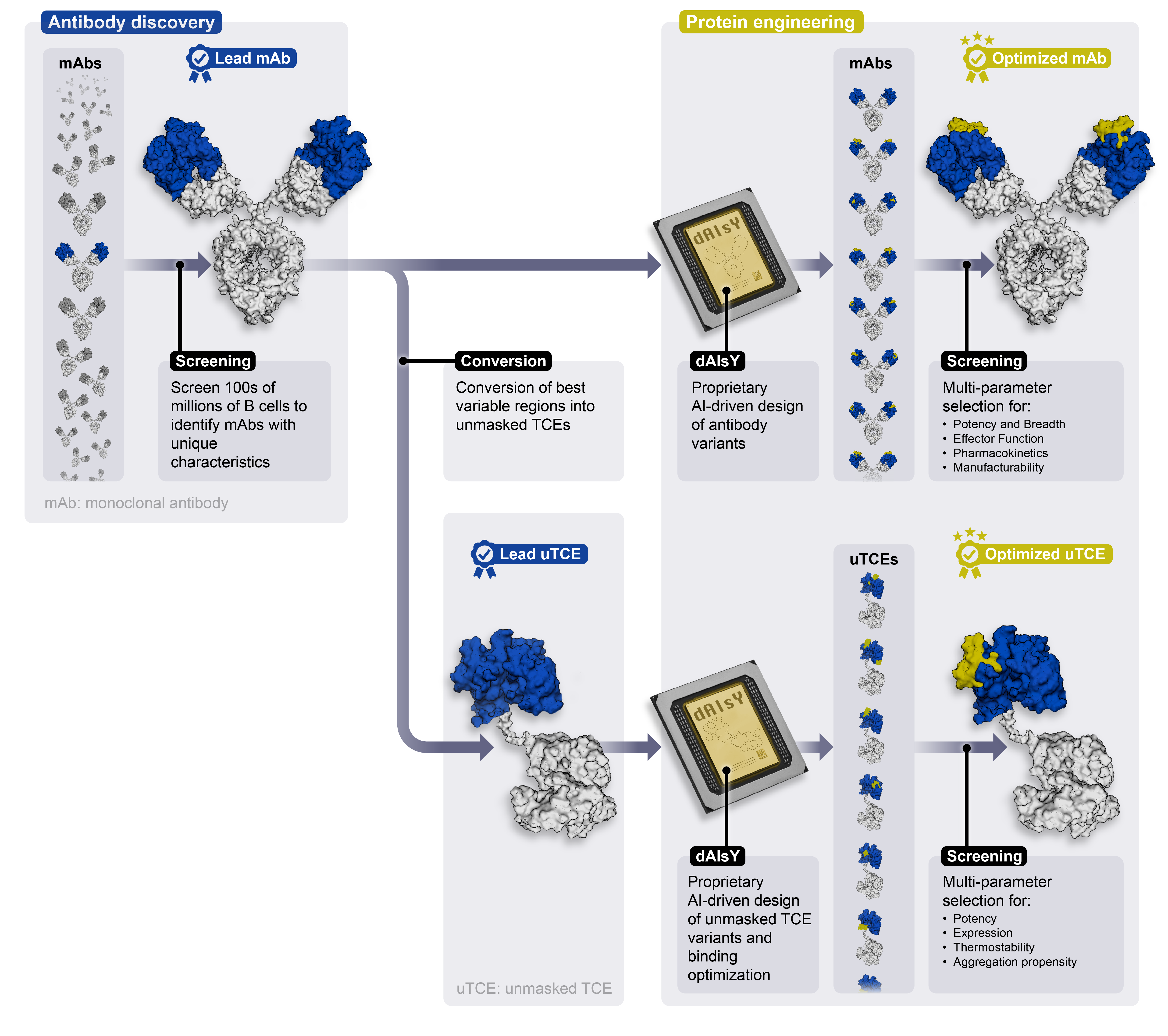Specifically, our proprietary artificial intelligence engine, dAIsY™ (data AI structure and antibodY), allows us to bring high-quality drug candidates to the clinic more efficiently. dAIsY™ uses a mix of open source and proprietary tools, enabling us to fine tune multiple desirable antibody characteristics simultaneously, ultimately generating drug candidates with the highest potential for success in clinical development.