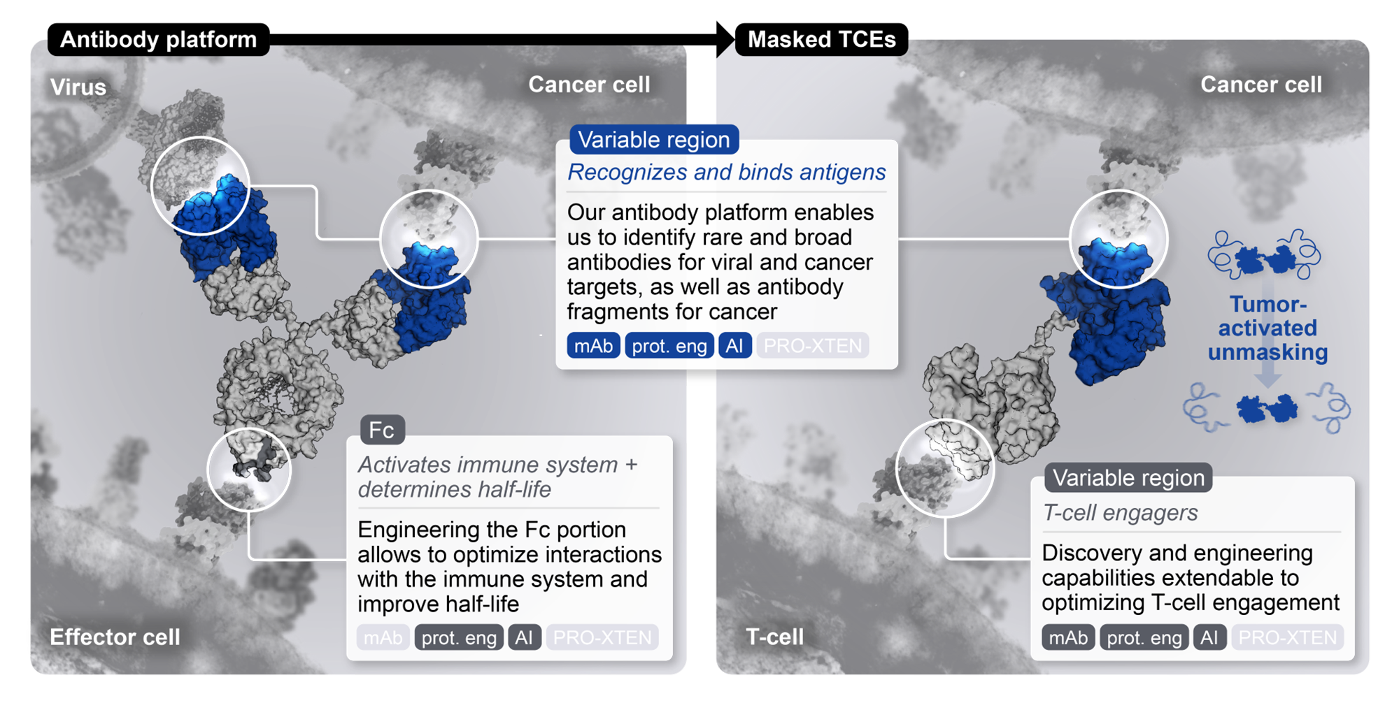 Leveraging this platform, we identify rare and broad antibodies and antibody fragments (which establish the basis for TCEs) for selected targets with enhanced selectivity and potency. Next, we engineer them to modulate how our drug candidates interact with the immune system. We also improve important features by using advanced tools like artificial intelligence.
